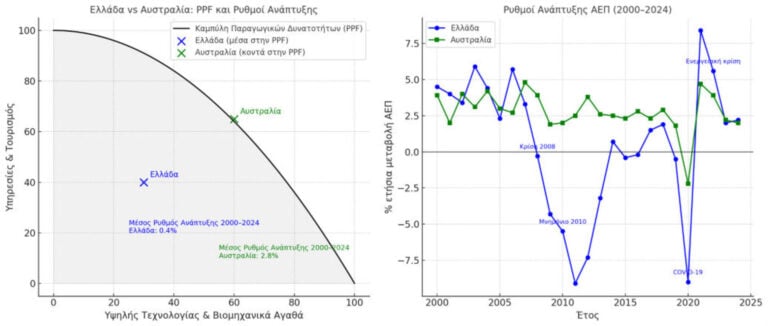 Το σχήμα υπογραμμίζει ότι ενώ η Αυστραλία διατήρησε ισχυρούς ρυθμούς ανάπτυξης, η Ελλάδα πα-ρέμεινε παγιδευμένη σε μια ισορροπία χαμηλής ανάπτυξης, αδυνατώντας να μετατρέψει μεταρρυθμί-σεις σε υψηλό κέρδη παραγωγικότητας.