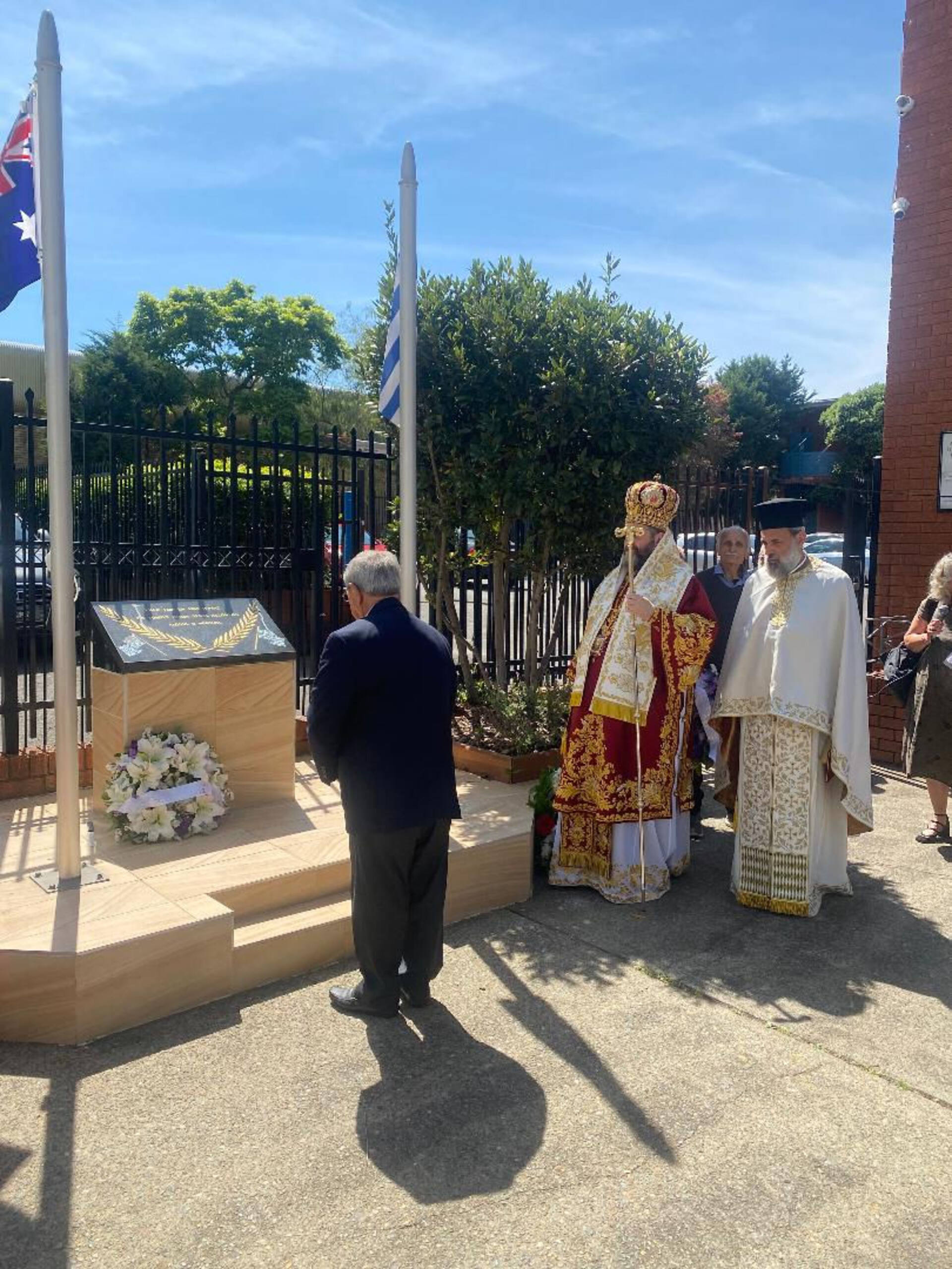 Μετά τον εκκλησιασμό, οι συμπάροικοι συγκεντρώθηκαν γύρω από το Ηρώο για τους πεσόντες που βρίσκεται στον προαύλιο χώρο του Ιερού Ναού για την Επιμνημόσυνη Δέηση. Εκεί ψάλθηκε ο εθνικός ύμνος της Ελλάδας, τηρήθηκε ενός λεπτού σιγή και πραγματοποιήθηκαν καταθέσεις στεφάνων για τους πεσόντες Λημνιούς και υπόλοιπους Έλληνες στον αγώνα για την αποτίναξη του Οθωμανικού ζυγού και την τελική ενσωμάτωση της Λήμνου στον ελλαδικό κορμό. Τους παραβρισκόμενους καλωσόρισαν εκ μέρους της Λημνιακής Αδελφότητας ο πρώην πρόεδρος του φορέα κος Κωνσταντίνος Χαβάς, ο πρόεδρος της Ελληνικής Ορθόδοξης Ενορίας-Κοινότητας της Αγίας Ευφημίας του Μπάνκσταουν κος Χρήστος Σπυρόπουλος και το δραστήριο μέλος των Λημνίων-σκηνοθέτιδα κα Ελισάβετ Κάυδου, οι οποίοι έκαναν σύντομες αναφορές στο πανηγυρικό της σημαντικής επετείου της 8ης Οκτωβρίου 1912 καθώς η Λήμνος ήταν το πρώτο Αιγαιοπελαγίτικο νησί που απελευθέρωθηκε στέλνοντας τότε «κύματα» αισιοδοξίας σε όλο το Αιγαίο πέλαγος.