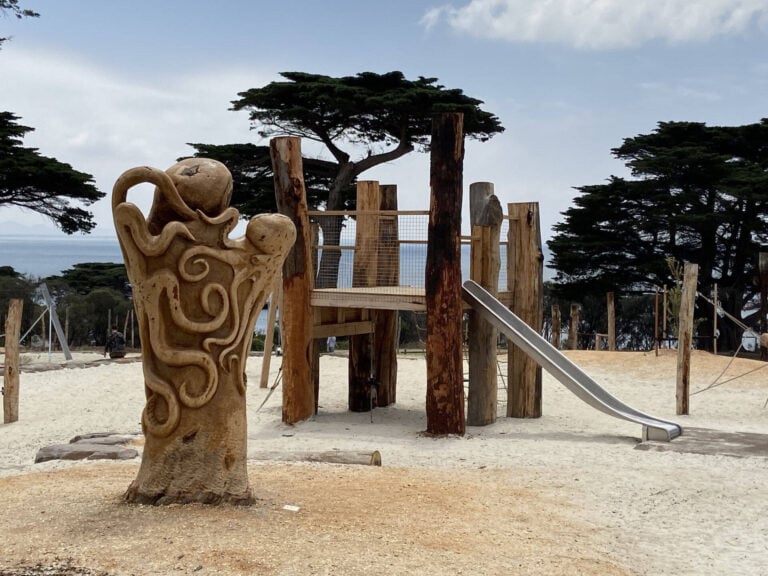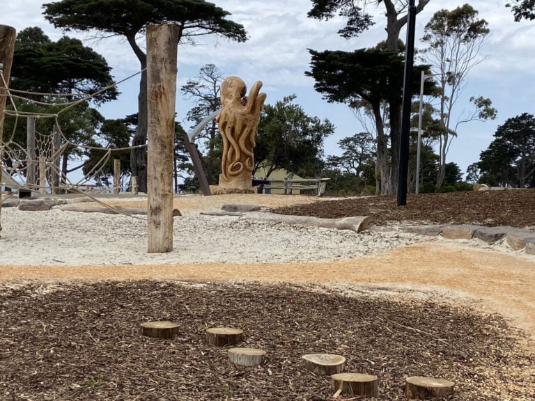 The playground beside the sea sets the scene for family fun during the Portarlington Greek Festival, surrounded by native trees and Bellarine Bay views.